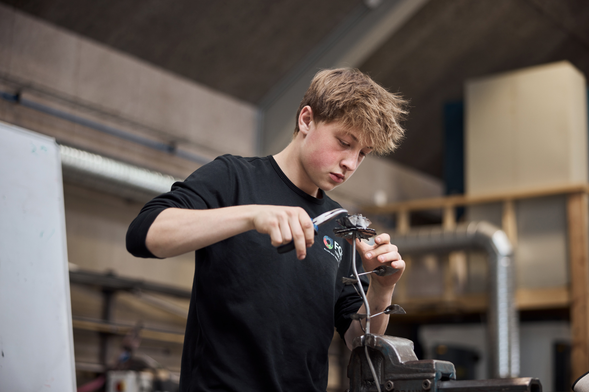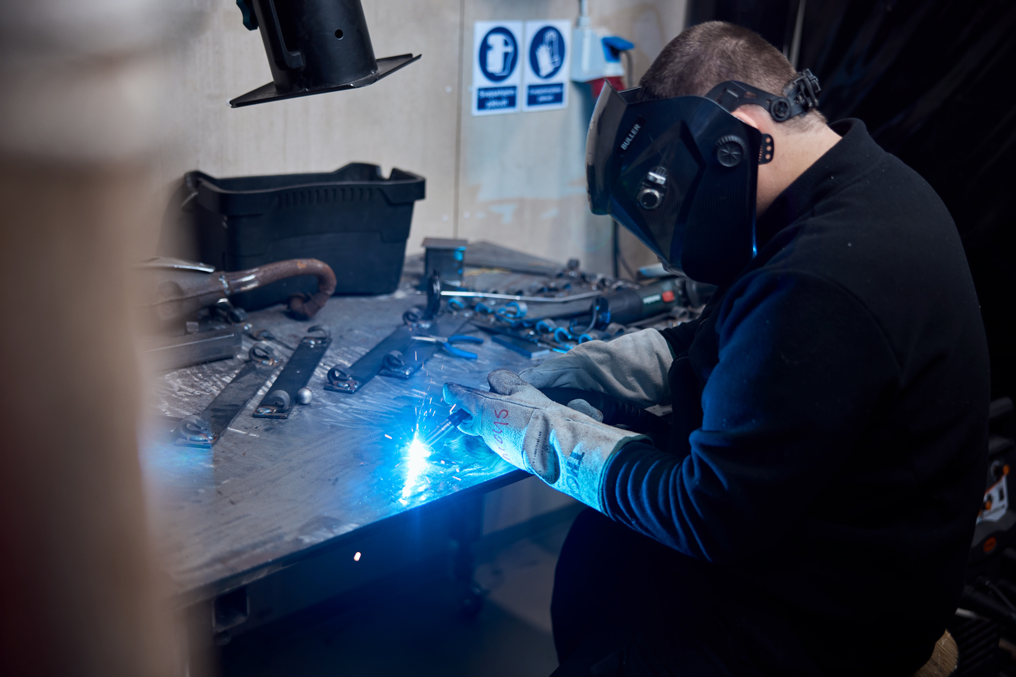 Du kommer til at bruge forskellige maskiner og værktøjer til at skære, svejse og bukke. Vi producerer alt fra bord-/bænkesæt til boldvogne, og vi løser både opgaver for kunder og for skolen.