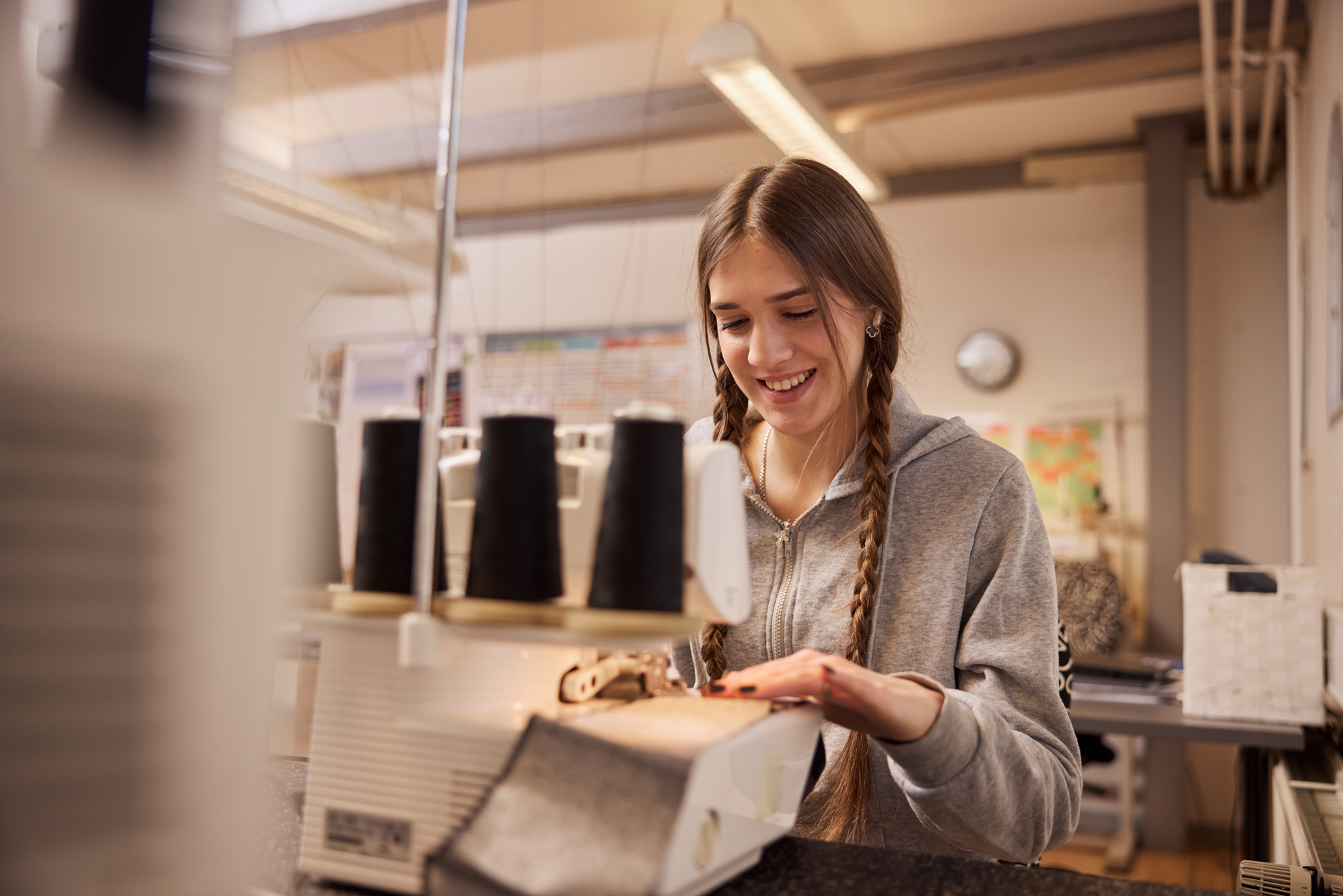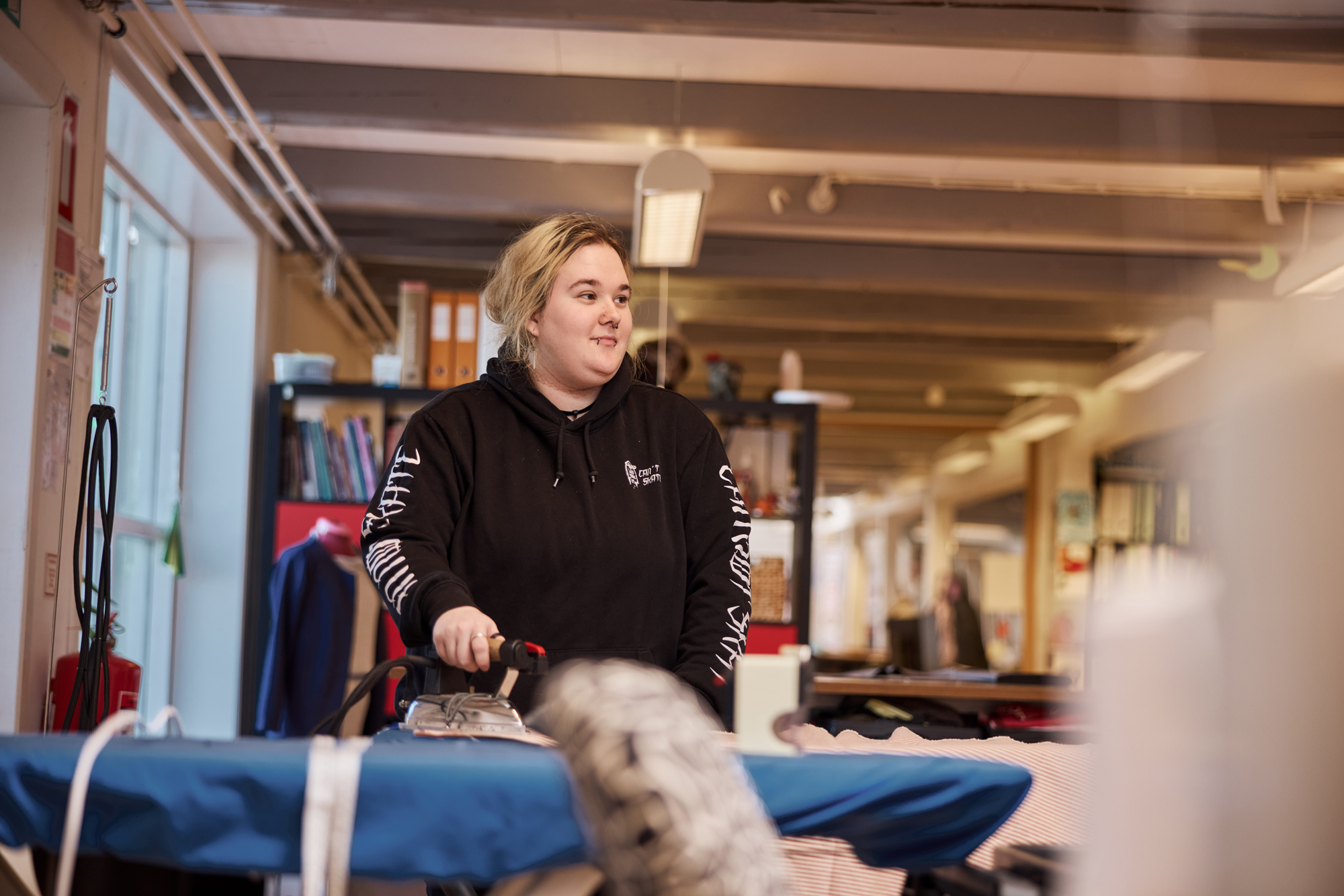 Her laver vi alt fra kostumer til gardiner. Desuden har vi en lille butik på skolen, som vi står for og laver forskellige produkter til – eksempelvis laver vi tøj og julepynt, som sælges der.